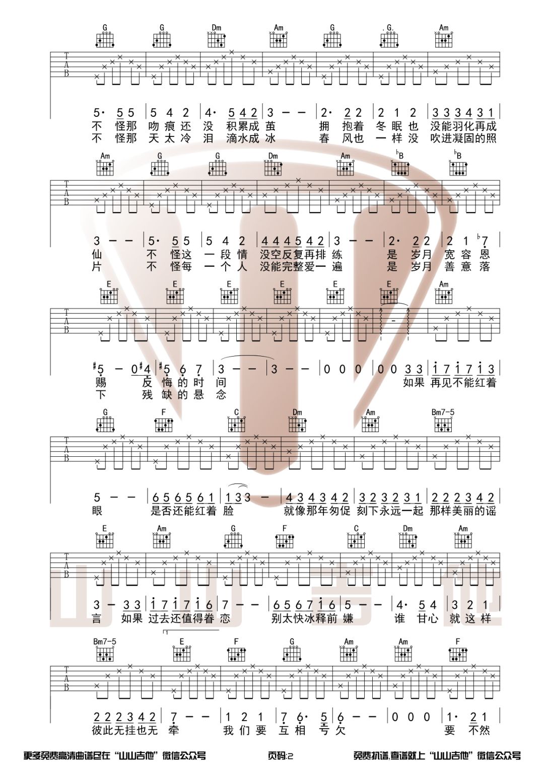 曲谱说明:《匆匆那年》吉他谱_王菲_C调原版弹唱谱_吉他弹唱教学分享,《匆匆那年》是由林夕作词、王菲演唱的一首歌曲,也是电影《匆匆那年》的同名主题曲。王菲动人的声音配上感人的歌词,每一个音符都在敲击着听众的内心,演绎着电影中感人的剧情和动人的情景,令人动容。另外歌曲的歌词也是十分戳人,MV戳泪,直接引发了观众对于青春的集体共鸣,纷纷表示要重回校园去感受青春。